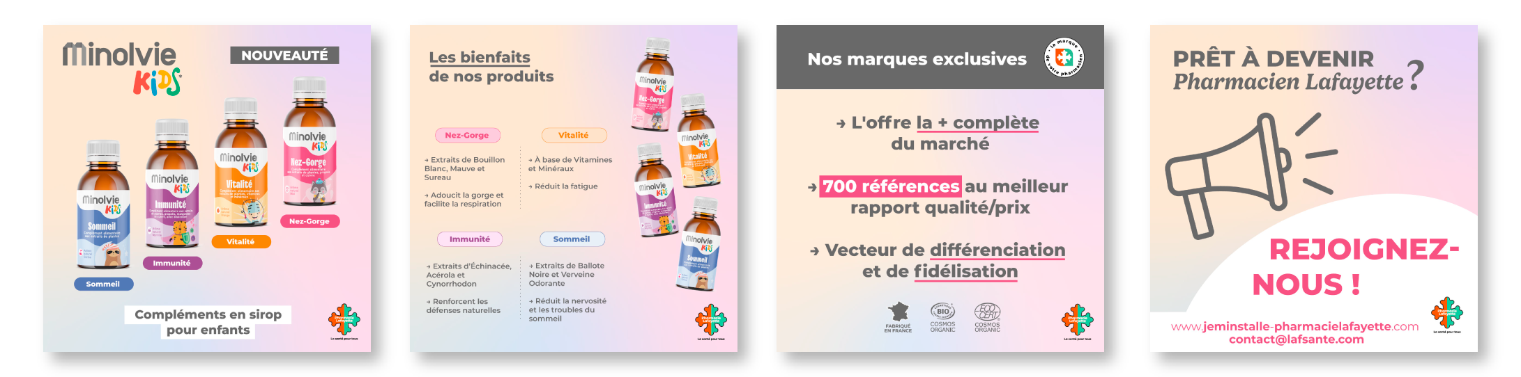 L’enjeu principal était de renforcer la reconnaissance de ces gammes et leur donner une visibilité claire en pharmacie. Ce travail passait autant par des campagnes nationales que par des missions spécifiques (conventions, séminaires, demandes particulières d’adhérents).